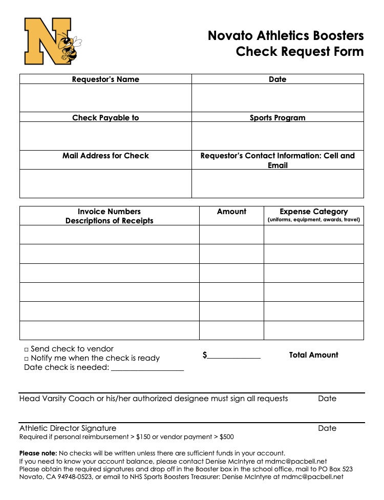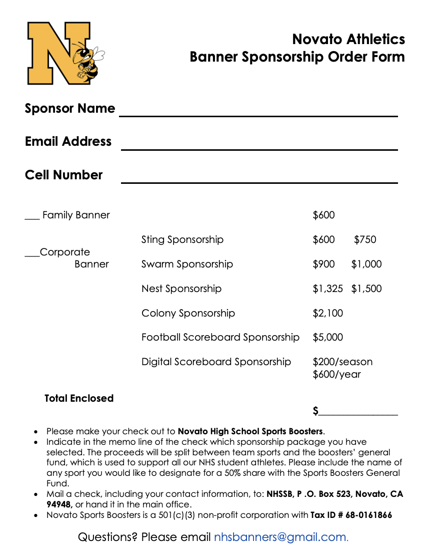 To become a member of the NHS Sports Boosters please print this form, complete it and return to Novato High School. Click HERE to print